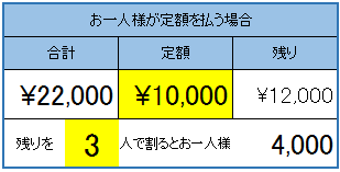代表者が10,000円払うから、残りをみんなで割勘する場合の支払金額の計算です。