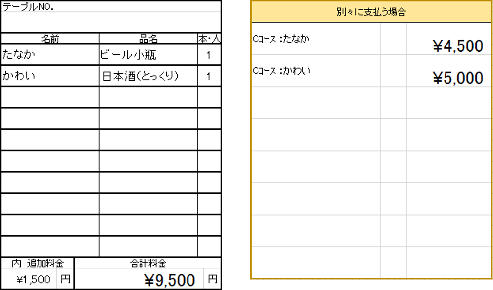 セット料金では、4000円なのですが、鈴木さんはウィスキーをハイボールに、川口さんはビール中瓶を2本追加、田中さんは、日本酒を3本、伊藤さんはコークハイを4杯飲みました。このような時の会計計算をわかりやすく表示します。