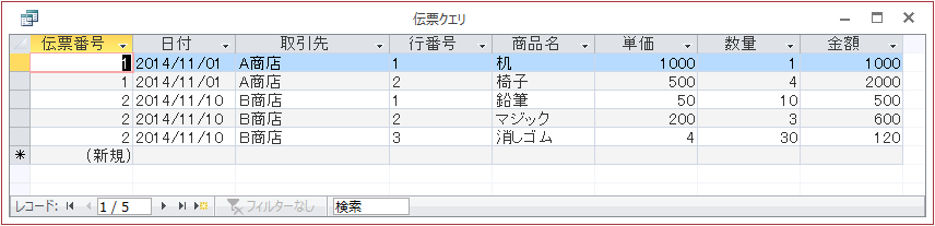 表題データと明細データは「伝票番号」により関連付けられています。関連付けて作成したテーブルが、下のテーブルです。