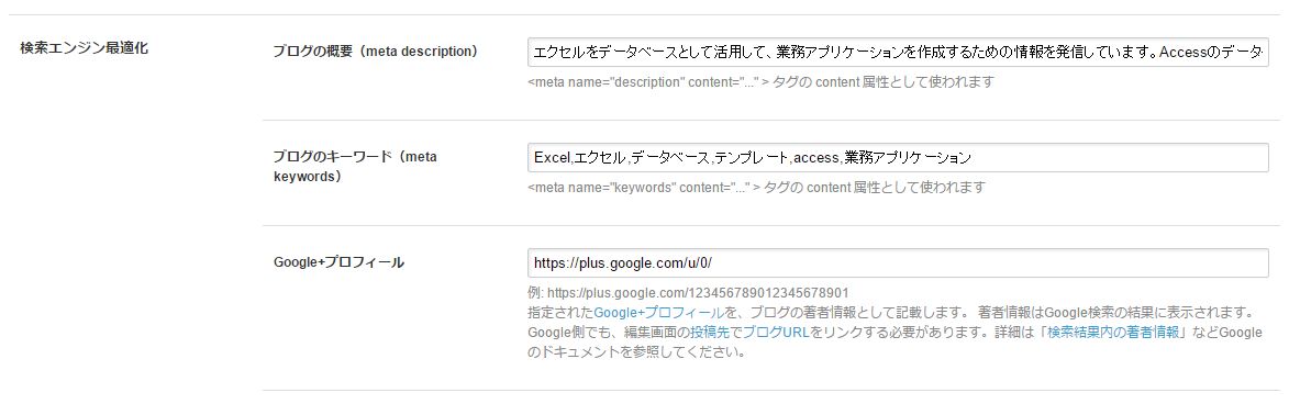 また、ブログの概要(description)にも「Excel,エクセル,データベース」のキーワードを含めた内容を記入しました。