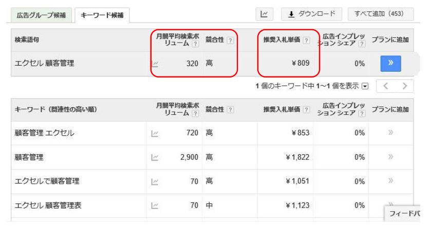 では、「エクセル 顧客管理」と「顧客管理 エクセル」の2つのキーワードで広告を出すといくらかかるのでしょうか。