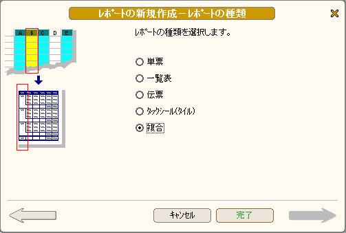 桐のレポート定義では、下図のように最初にレポートの種類を選びます。