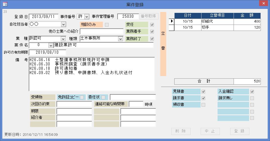 立替金、業務の進捗状況、預かり書類を管理可能。