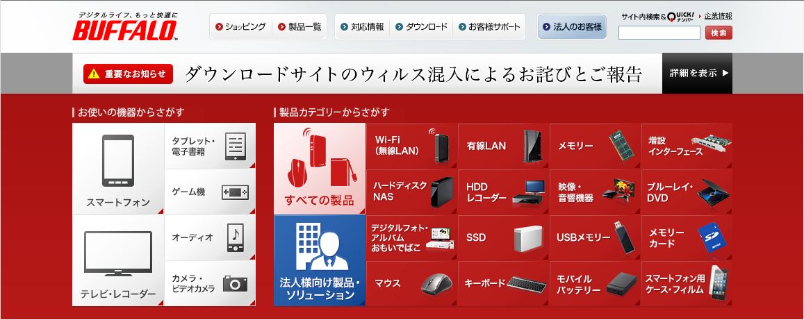 電子機器メーカーの「バッファロー」も、先月27日の早朝から昼すぎまで、ホームページからダウンロードするファイルに、同種のウイルスが仕組まれました。このファイルは、無線LANの接続機器を利用するためのものなどで、この間に、850回余りダウンロードされたということです。こうした被害を受けた国内企業は、ホームページの利用者に、パソコンがウイルス感染していないか、十分、注意するよう呼びかけています。