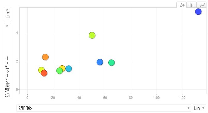 下のグラフ表を見てください。ランディングページを計測したグラフ表です。横軸が「訪問数」、縦軸が「訪問別ページビュー」の Google Analytics のグラフ表です。