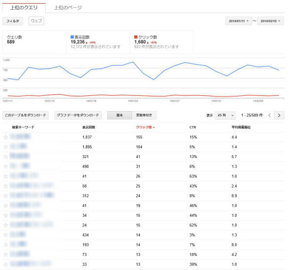 - 検索された場合のキーワードごとの平均掲載順位(クリックされていない場合も表示されます)。