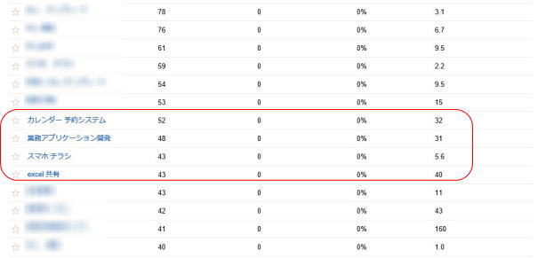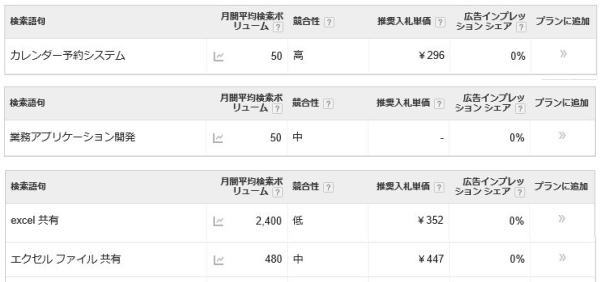そこで、Google Adwords を使って、「カレンダー予約システム」「業務アプリケーション開発」「excel 共有」のキーワードボリュームを調べてみました。