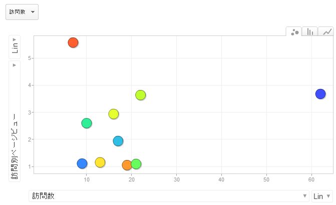 上の表は、「Google Analytics」のランディングページの情報です。横軸が「訪問数」、縦軸が「訪問ページビュー」、プロットは上位10位のランディングページです。